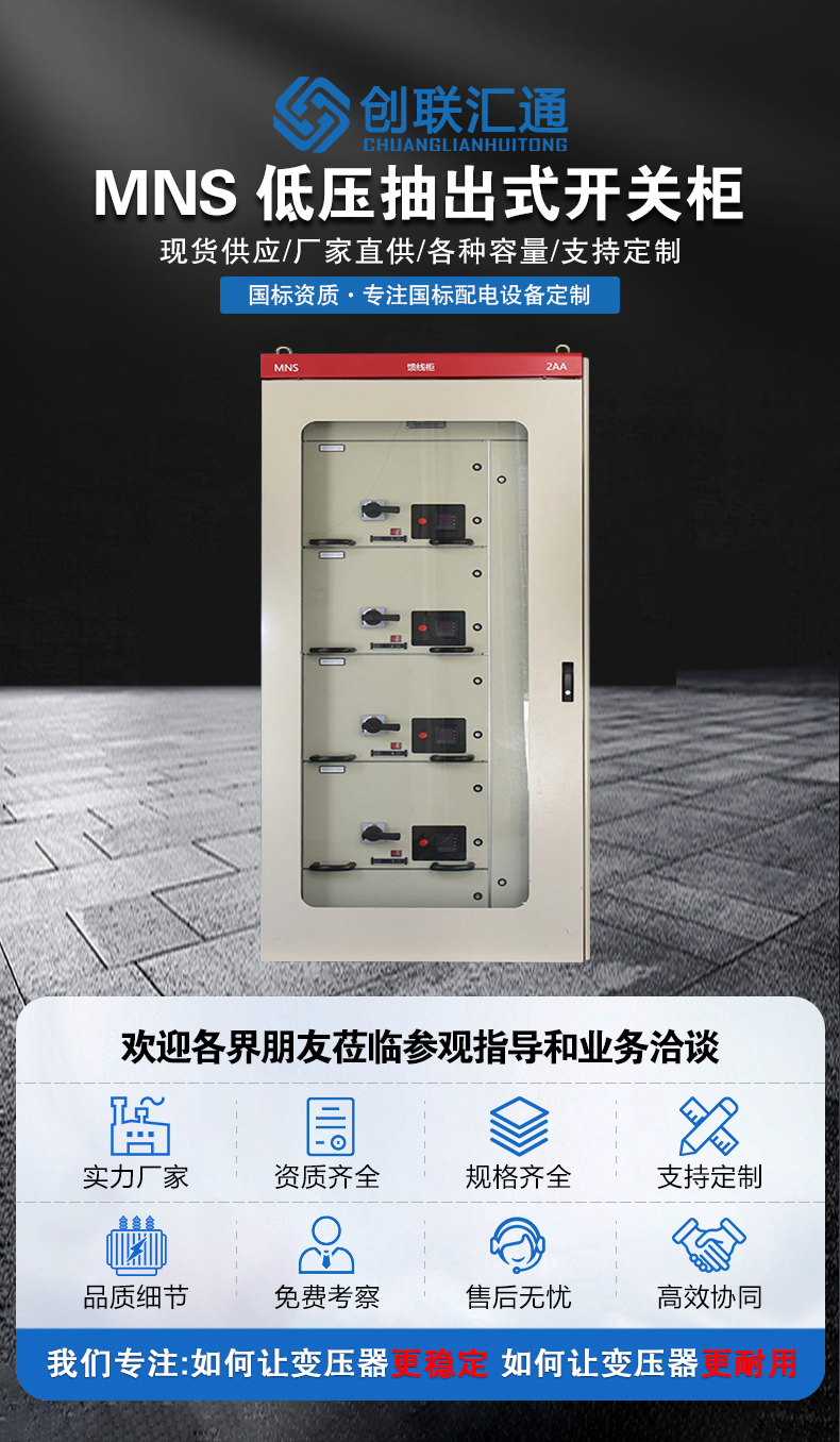 MNS型低壓抽屜式開關柜適用于三相交流50、60Hz,額定電壓660V,額定電流4000A以下的三相四線制及三相五線制電力系統,作為接受電能和分配電能之間。MNS柜也被稱為MNS抽屜柜或者MNS配電柜。