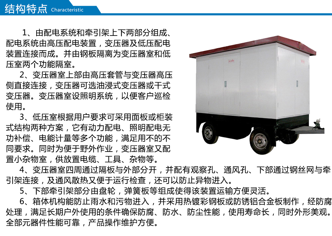 移動式箱式變電站產品為全密封、全絕緣結構,人身安全得到可靠保證,體積小,結構緊湊(該產品占地僅為同容量歐式箱變的1/3),安裝方便靈活,既可用于環網,又可用于終端,轉換方便,大大提高供電可靠性。